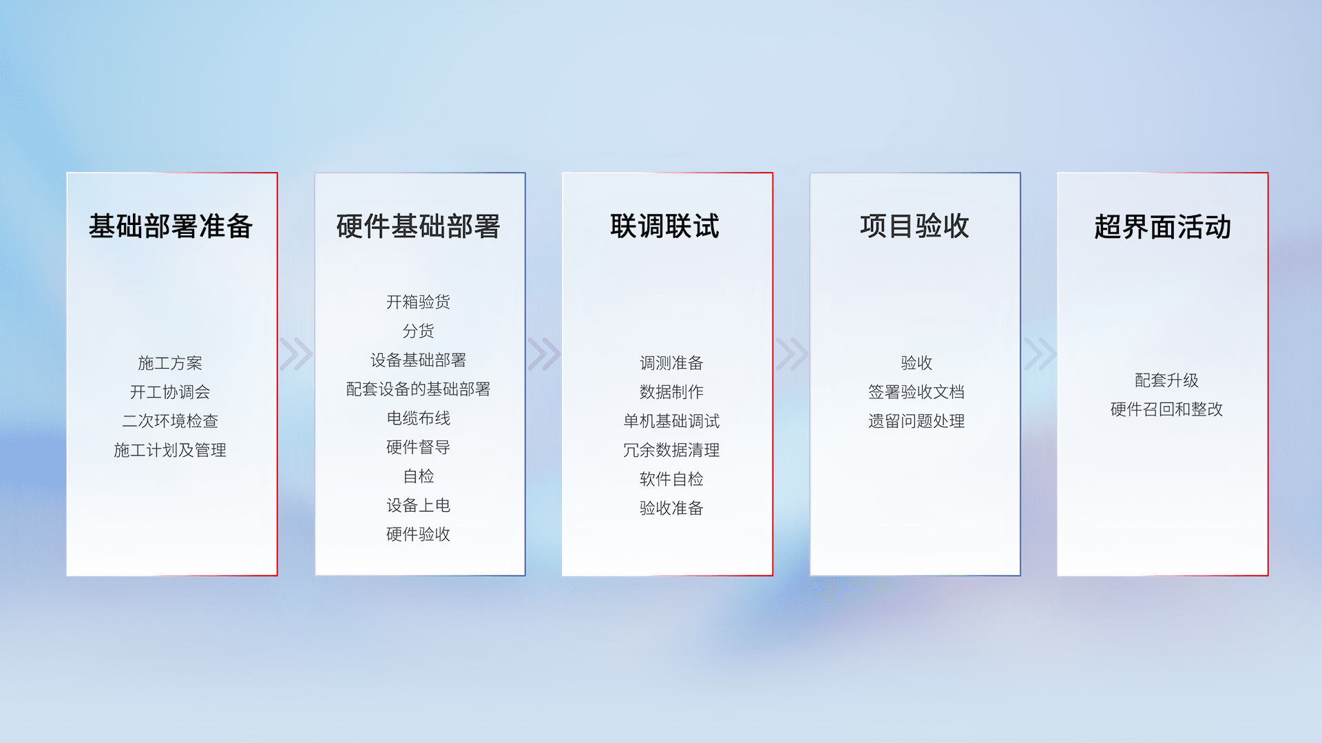 从基础部署准备、、、、硬件基础部署、、联调联试、、、、项目验收、、越界面活动的全过程可追溯,,保证施工质量和进度。。。